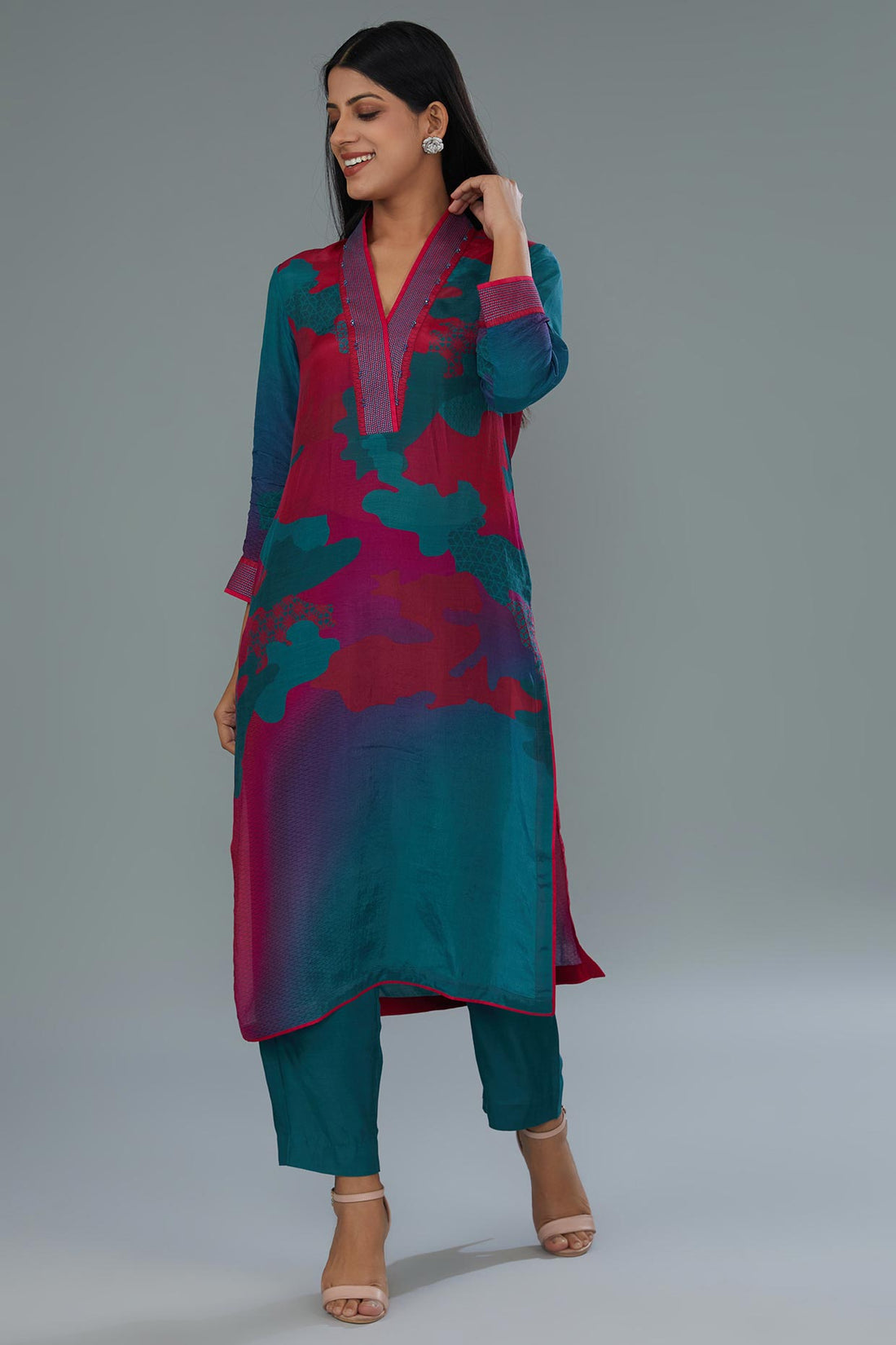 Our teal blue and pink cotton silk digital print co-ord set features a straight-fit tunic...