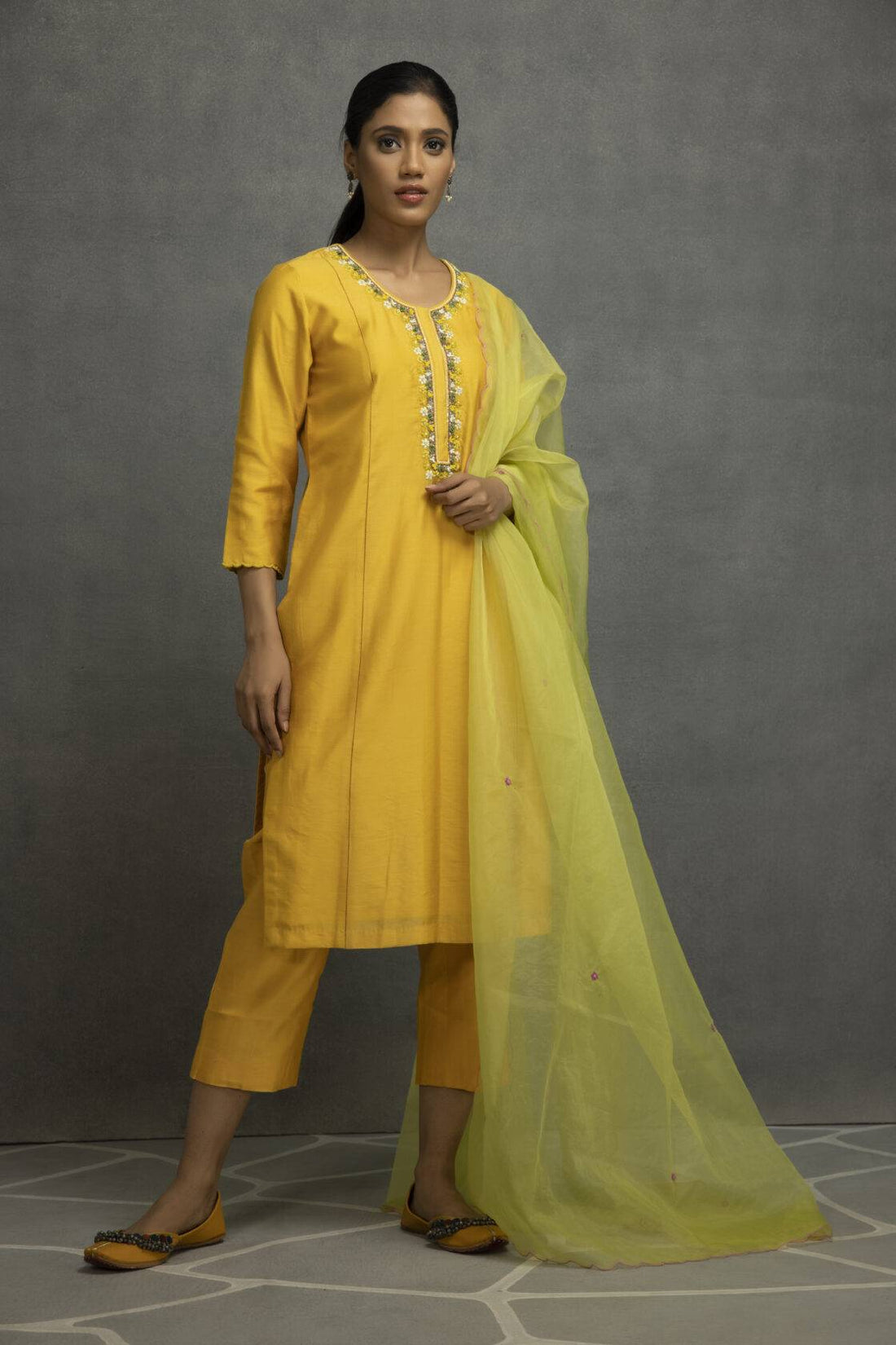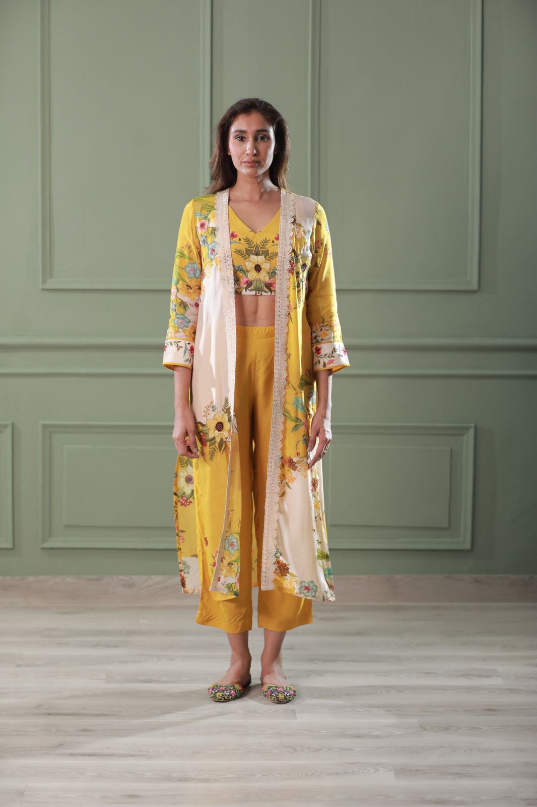 Featuring a yellow  3piece set in cotton silk base and  hand embroidery with digital print,...