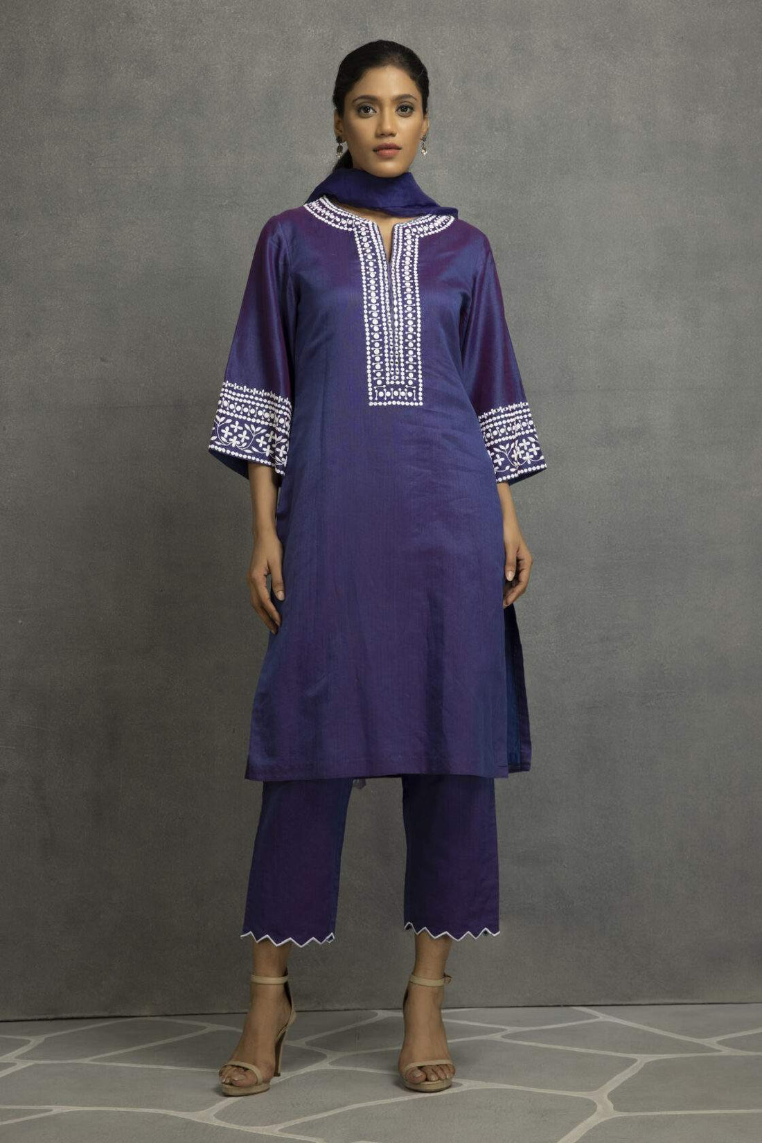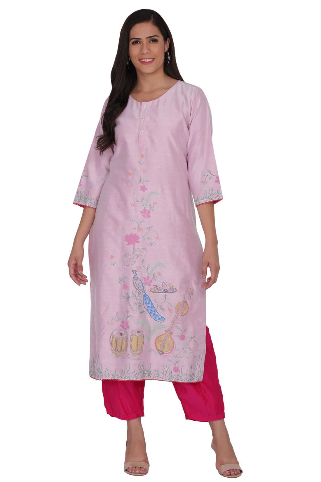 Straight kurta with palazzo set. Dori on neckline, 3/4 sleeves with instrument embroidery and piping...