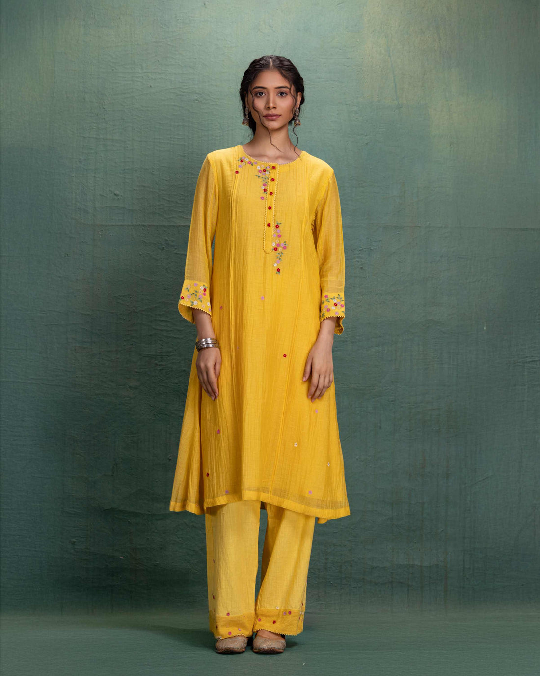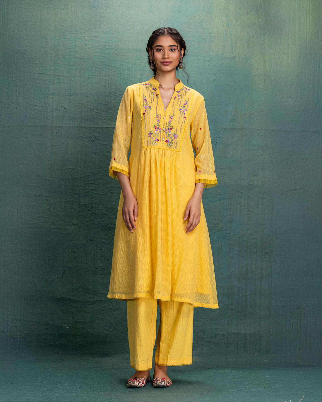 Crafted in a vibrant yellow hue, this coordinated set features a beautifully detailed yoke adorned...