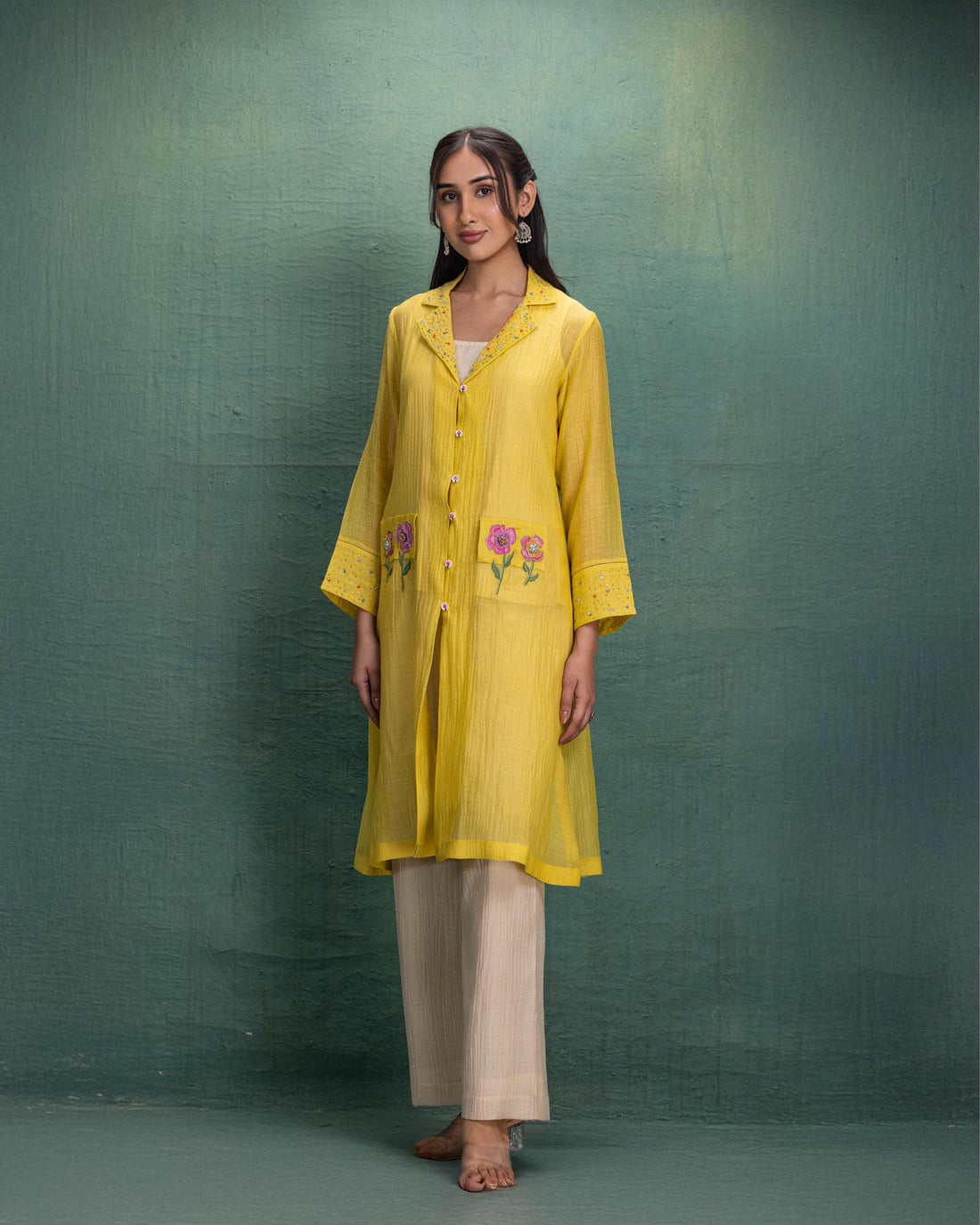 Yellow Shrug Set with Handcrafted Embellishment and Floral Motif Pockets
