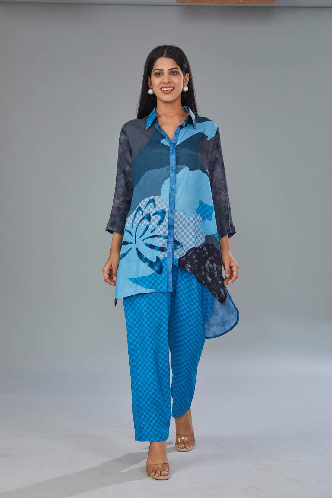 Blue Digital Print Asymmetrical Cord Set with Fine Line Detailing