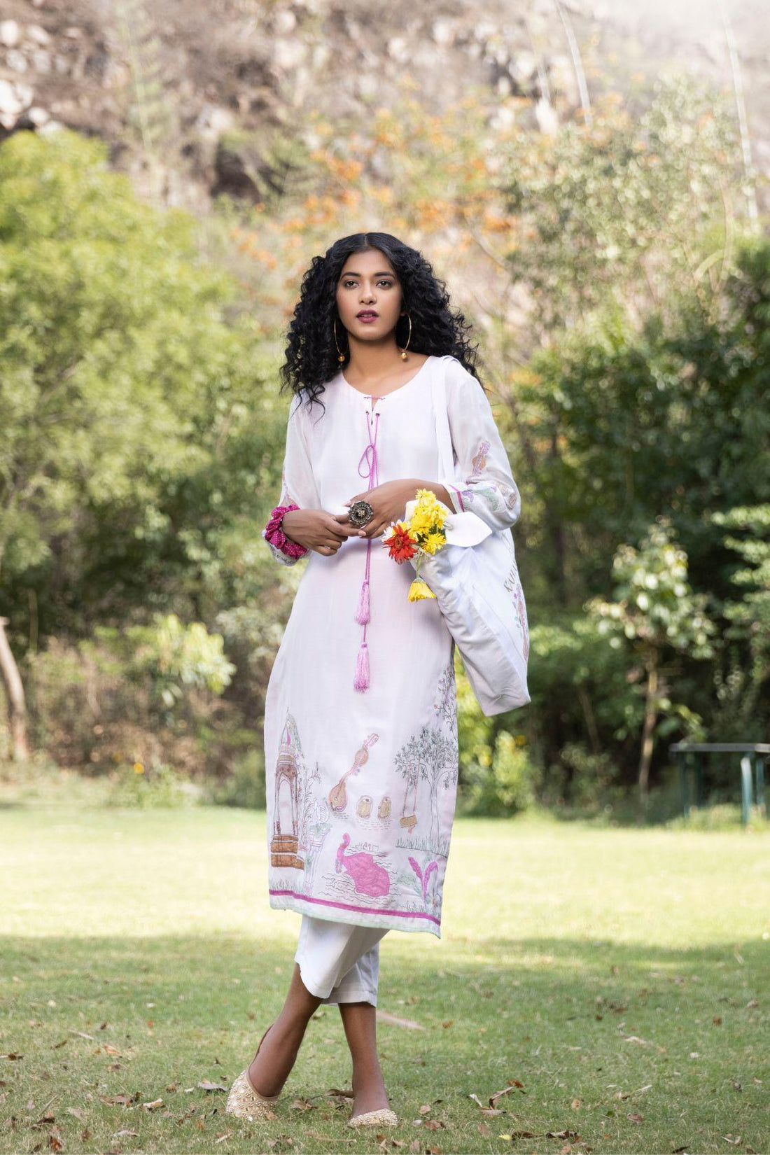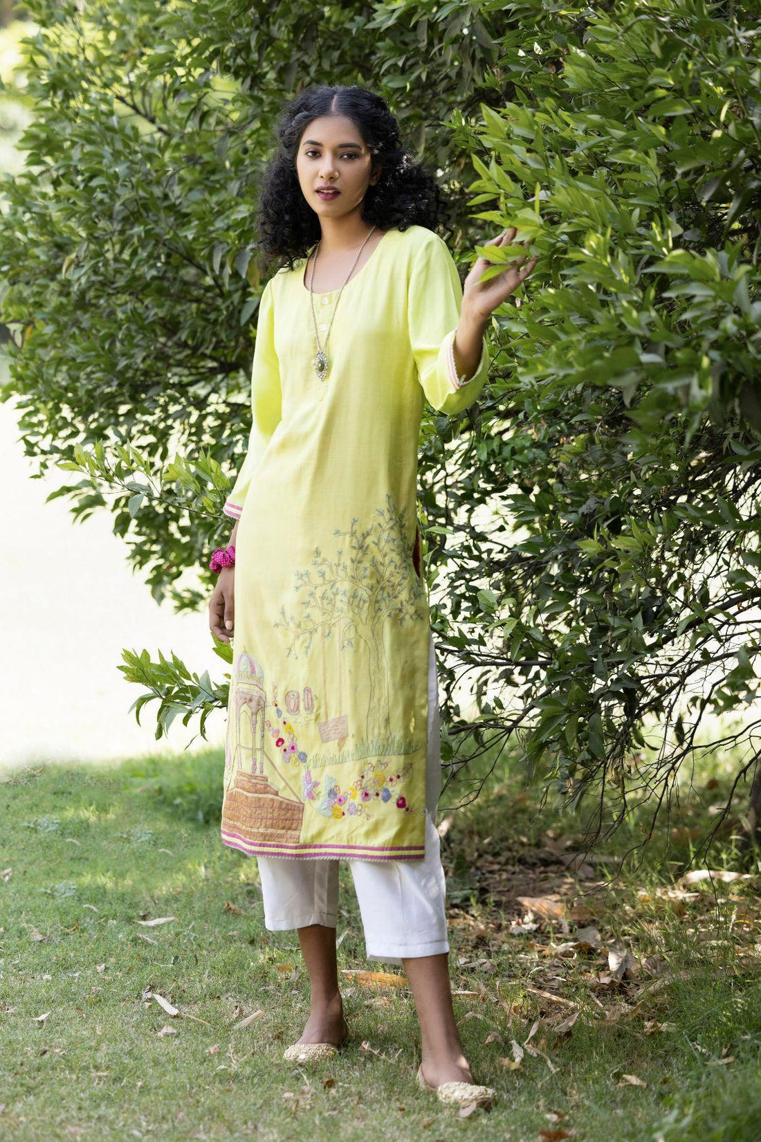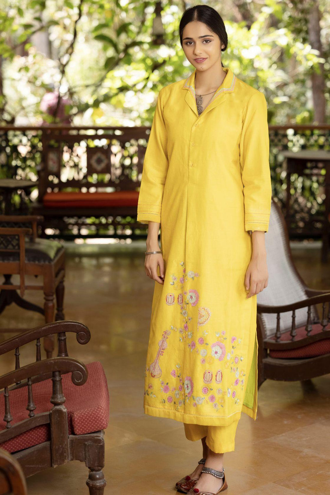 Straight kurta with palazzo set. Dori on neckline, 3/4 sleeves with instrument embroidery and piping...