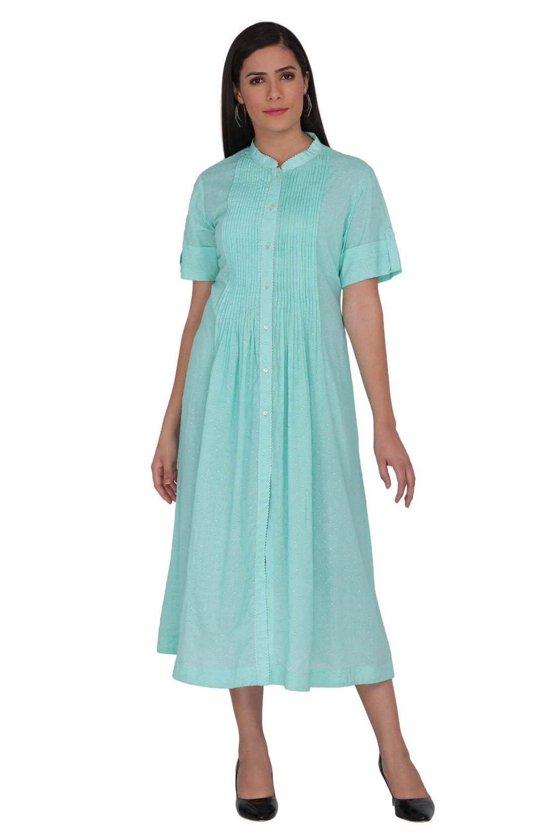 Midi dress with center placket and pintucks which gives the flare, ladder lace on collar...