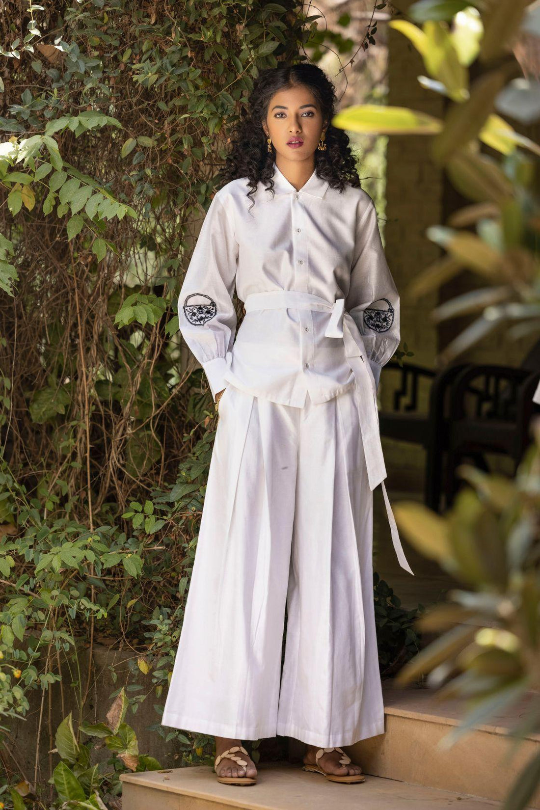 Melody co-ord set including shirt and pleated palazzo. Full puff sleeves with broad cuffs, embellished...