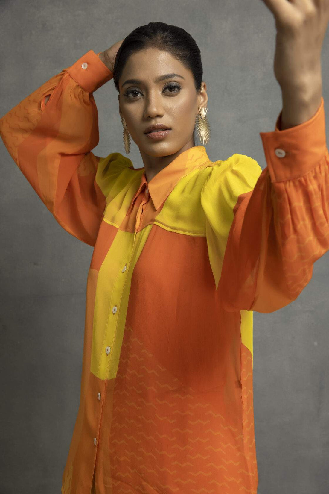 Orange Yellow Digital Printed Shirt In Georgette Base