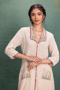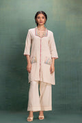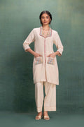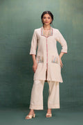 This beige cord set features a unique mesh fabric, creating a beautiful jali effect. The delicate machine embroidery on the mesh collar and cuffs adds intricate detail, combining traditional artistry with contemporary design for a sophisticated look. |