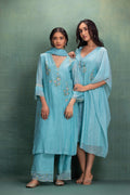 A stunning blue kaftan dress featuring a blend of intricate machine and hand embroidery, offering a perfect fusion of comfort and elegance. |