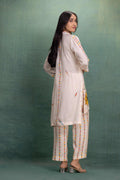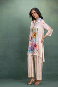 Delicate cream cord set adorned with a vibrant digital print and floral motifs, offering a fresh, modern look with a touch of nature-inspired elegance.