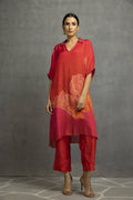 Dark Red And Pink Printed Long Collar Kurta