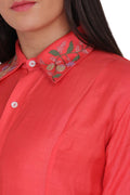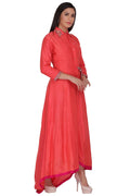 High low full length shirt dress with slight embroidery on collar, sleeves and on ribbon. Dress hemmed with contrasting border. The tie ribbon join the placket and side seam.