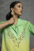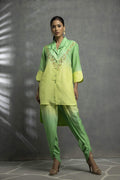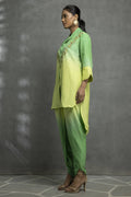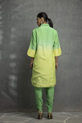 Discover elegance personified with this cotton silk co-ord set. The green-yellow ombre high-low kurta boasts a distinct V-collared neckline highlighted with exquisite embroidery. The cuffed sleeves and front buttons blend seamlessly with the delicate silhouette. Paired with matching dhoti pants, the set showcases a symphony of artistry and elegance. Teaming it with stylish earrings and high heels can add a rich sophistication to your look and make you an absolute stunner at formal occasions and parties.