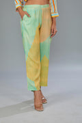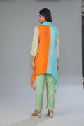 This off-beat yet sophisticated co-ord set in cotton silk fabric can refresh your wardrobe. The major highlight is the asymmetrical shape of the tunic, with pastel-hued digital print and anchor thread detailing on the neckline. The subtle bead machine embroidery on the neck and sleeves accentuates the style. Paired with elegant trousers with side pockets, the ensemble is perfect for formal and semi-formal occasions. Styling it with a matching pair of earrings, a sling bag, and heels can enhance the look even more.