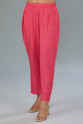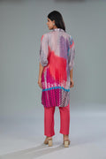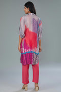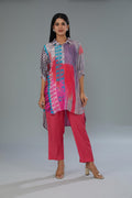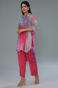 The multi-coloured cotton silk high-low co-ord set is ready to oblige your wardrobe and make it brighter. Highlighting the digital-printed tunic are subtle shades of pink, mauve, blue and grey, giving a unique touch to the ensemble. The hanging shoulders, collared neckline and stylish kimono sleeves add a self-assured vibe to the attire. Teamed with elegantly fitted pants, this co-ord set is perfect for formal and semi-formal occasions. Pairing it with stud earrings and high heels can accentuate the look.