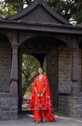 Dare to make a statement in this orange suit made in Luxurious blend of chanderi silk . It is enhanced with zari nd bead hand work Indian floral print pattern . Layer it over a set or matching set.