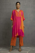 Orange Pink Printed Pleated Kurta In Cotton Silk Base