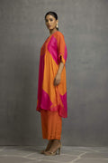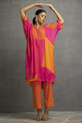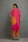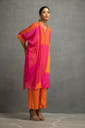 Orange pink printed pleated kurta in cotton silk base with embellishment, it is paired with matching pants.