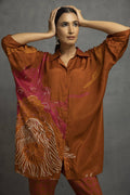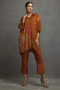 Rust summer digital printed long shirt natural cotton silk base gathered sleeve and highlight with sequence and bead hand embroidery.