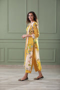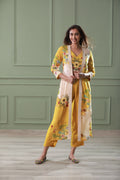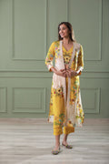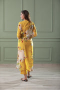 Featuring a yellow 3piece set in cotton silk base and hand embroidery with digital print, cuff sleeves. It is paired with matching pants.